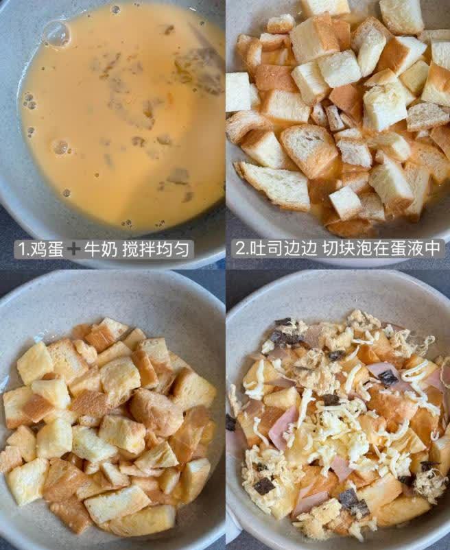 先把鸡蛋和牛奶搅拌均匀,把吐司切成块,泡在蛋液里面,每一块吐司都要均匀的沾上蛋液,放入一些芝士,再放入微波炉里面,加热3分钟即可。