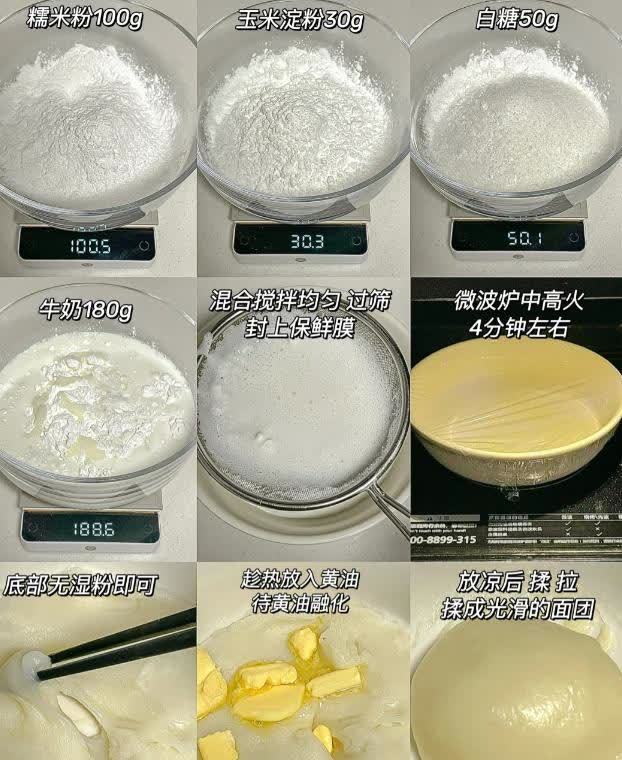 按照图片上准备一下食材:糯米粉、玉米淀粉、白糖、牛奶、黄油。