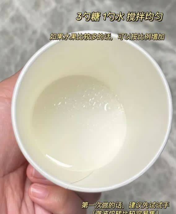先准备好喜欢吃的水果,牙签、一杯凉水、三勺糖。