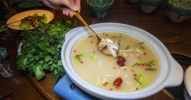 3:黔地仙草养生涮。这道菜的独特之处,在于其采用了药食同源的食材理念。汤底用贵州土鸡、猪骨、猪皮及具有养生功效的中草药材,加上文火4小时熬制,使汤底自然浓白,既醇厚又充满营养。除了精心熬制的汤底,这道菜还注重食材的搭配,选用黔东南丹寨的跑山鸡,肉质紧致细嫩,搭配盘县火腿,咸鲜入味,更大的提升了汤底的香味。
