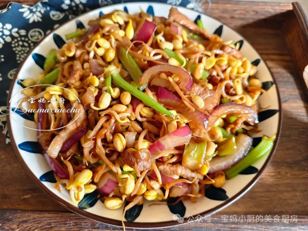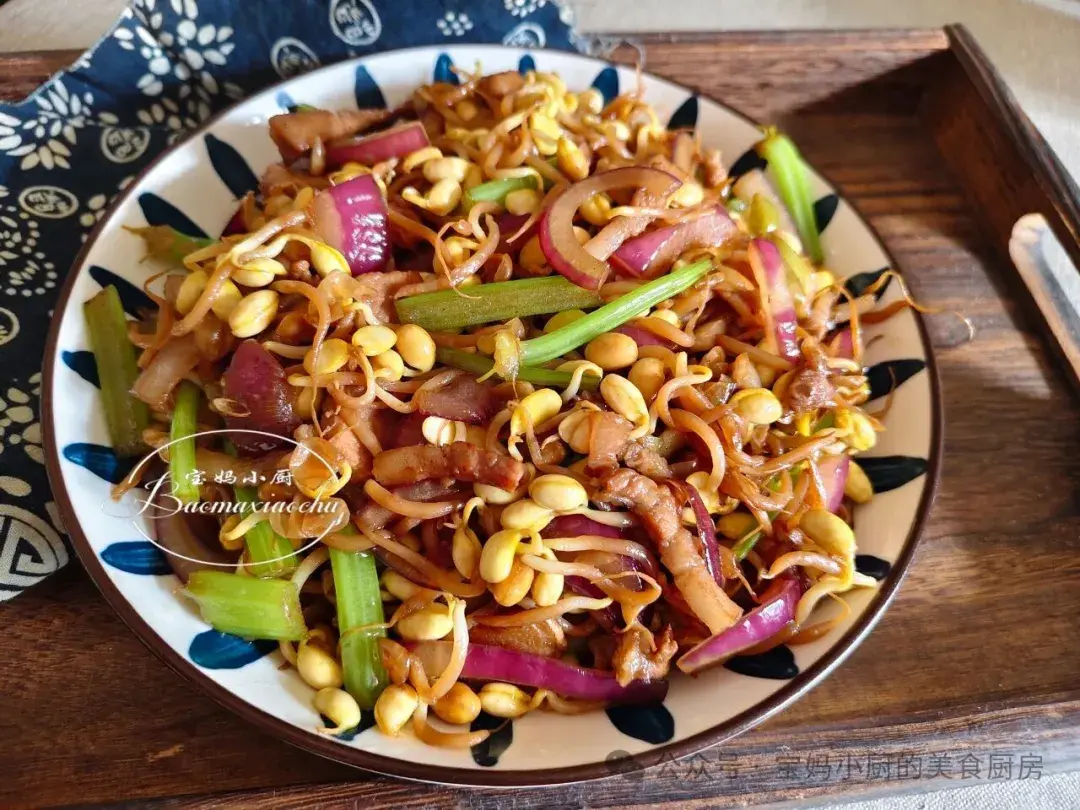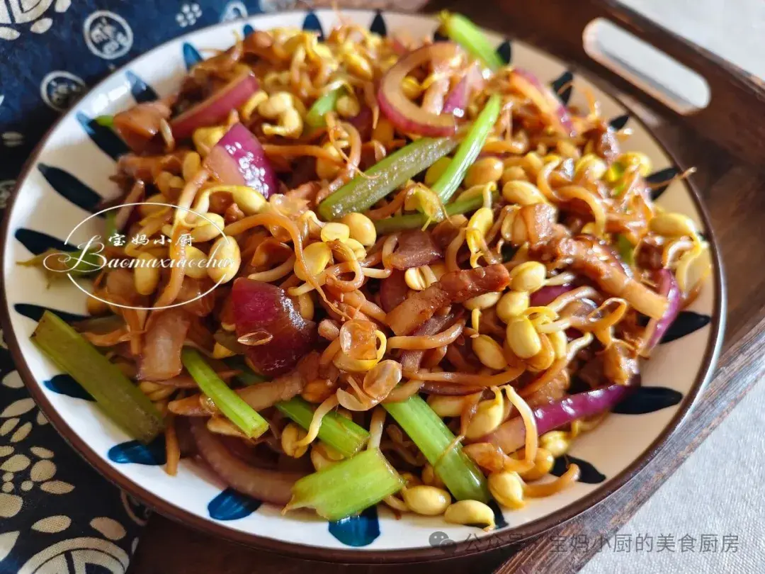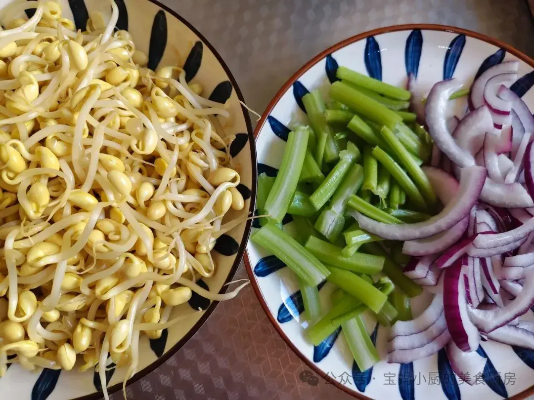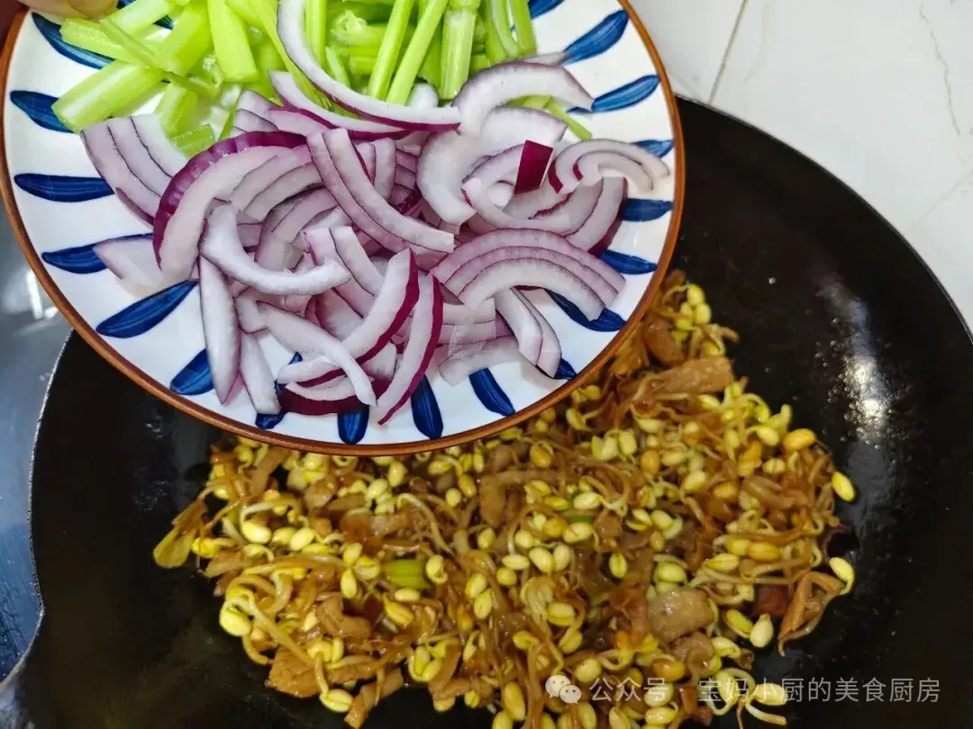 建议这道菜一定要可劲吃,尤其是寒冷的冬季。主要食材是黄豆芽,配菜是芹菜+洋葱,增香提味的是猪肉。