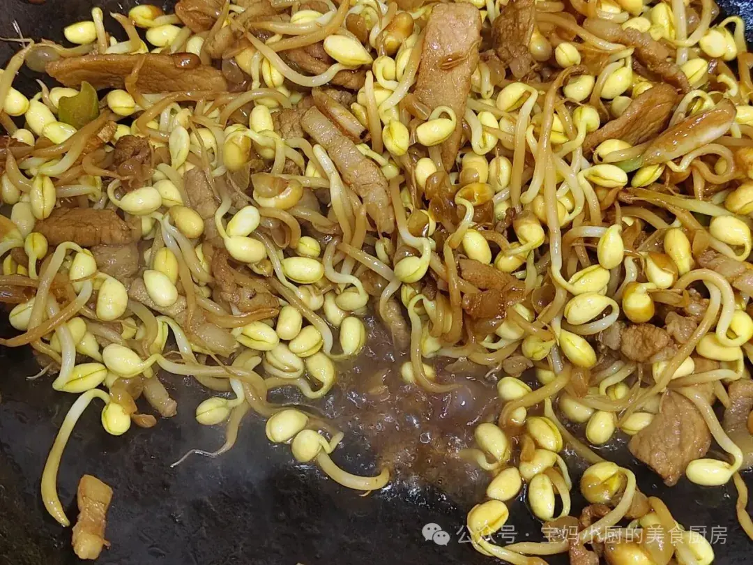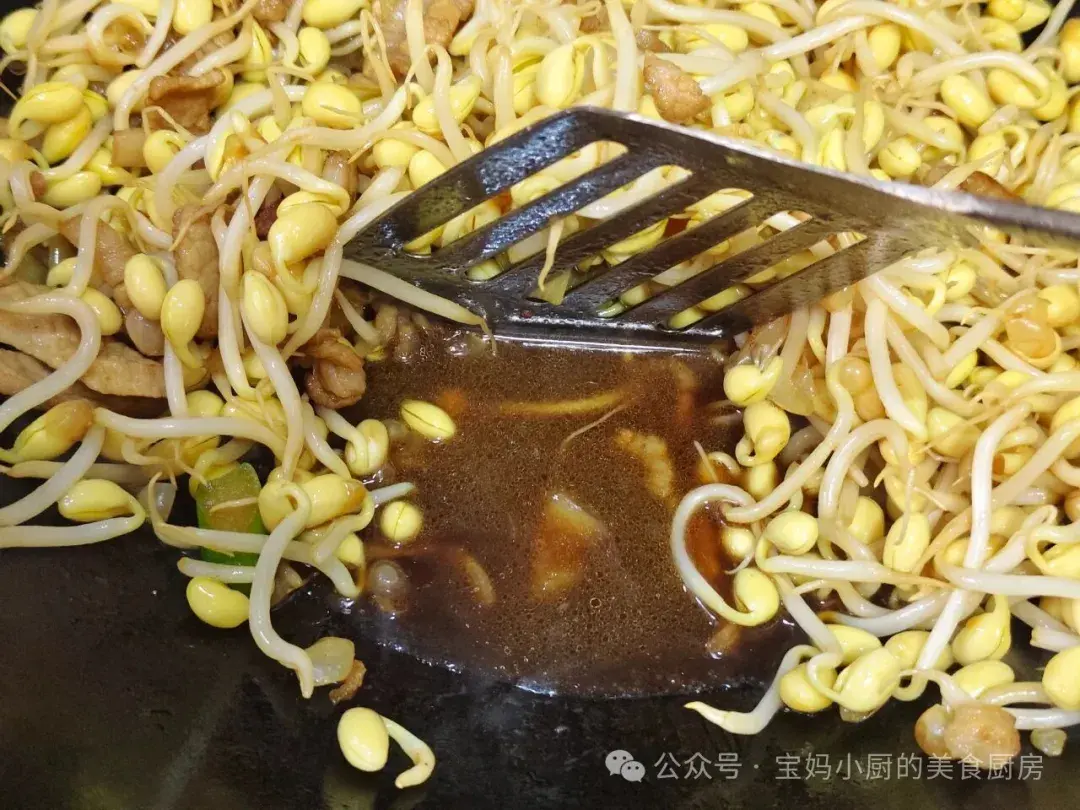 这道菜好吃的关键是黄豆芽下锅后会有汤,处理的方法是停一会炒几下,靠去大部分汤,这个过程既是让黄豆芽熟透,也是挥发豆腥气。
