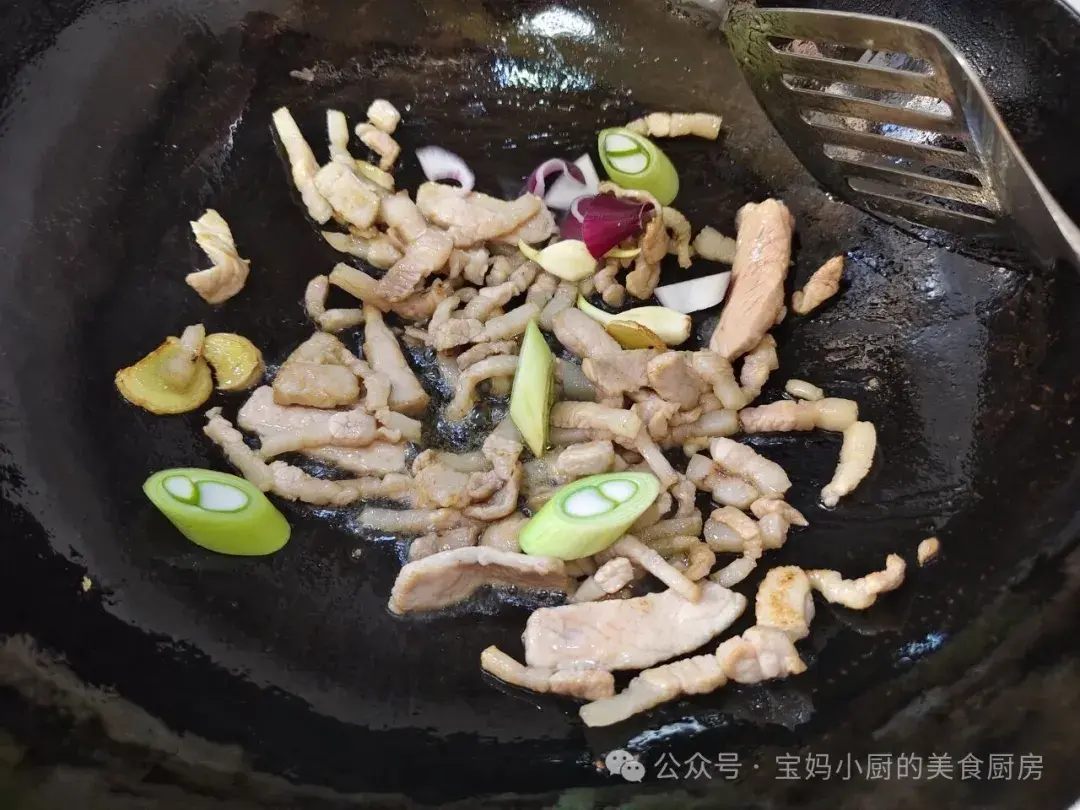 第三步,铁锅烧热,加入植物油和少许花椒油,放葱姜炒几下,倒入猪肉煸炒至变色。