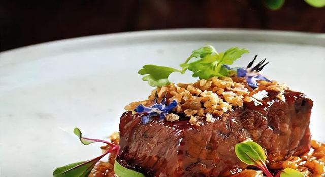 2、将大麦米泡发后用葱汁烧入味,收汁后装盘,放烧好的牛小排,点缀炸洋葱碎即可。