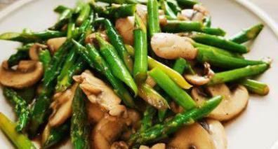 7. 炒蔬菜:在锅中加入少许油,先放入切好的口蘑翻炒至出水,加入芦笋段翻炒均匀,加入少量清水或高汤,焖煮2分钟,确保芦笋和蘑菇熟透。