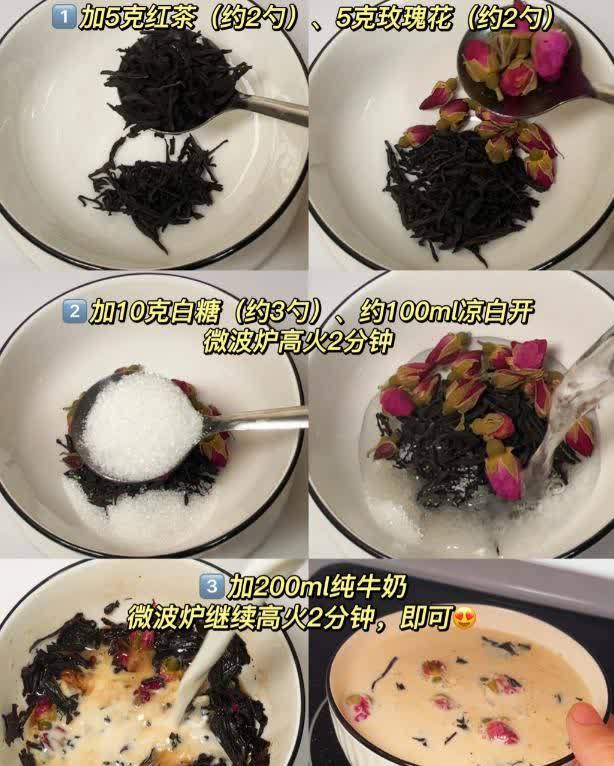 做法真的很简单,准备5g红茶,5g玫瑰花,10g白糖,加入100ml凉白开,然后放进微波炉里面加热,高火加热2分钟。