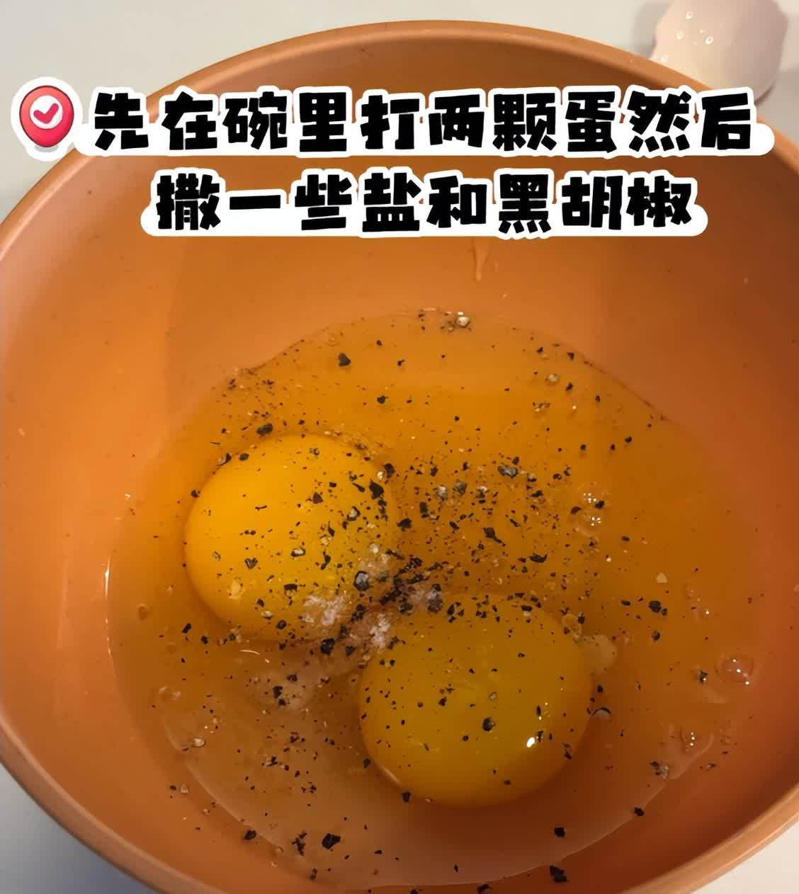 在碗里打入两个鸡蛋,撒一点胡椒粉和盐。