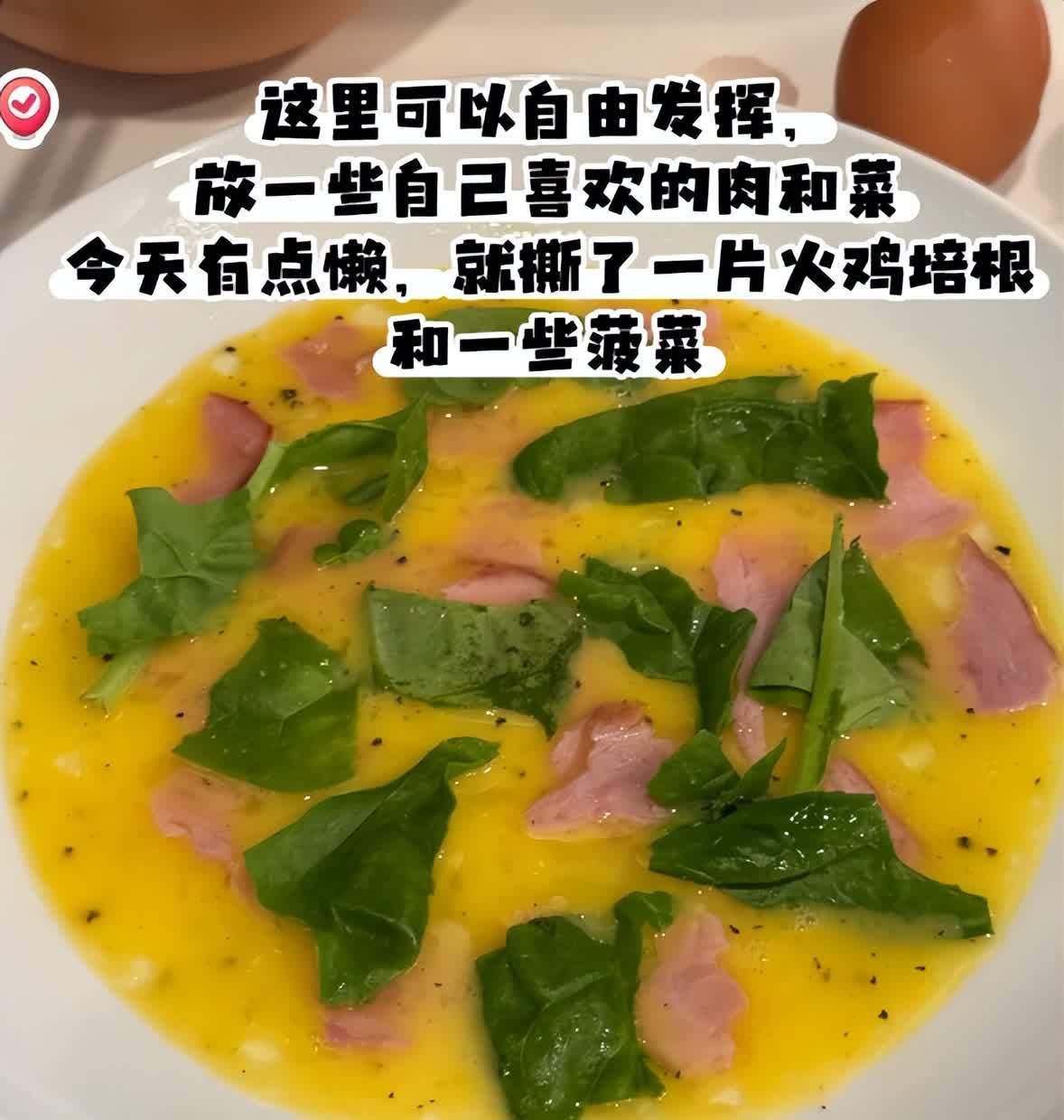 在蛋液上面放上一些自己喜欢吃的蔬菜、肉(可以放培根、菠菜、生菜都可以)