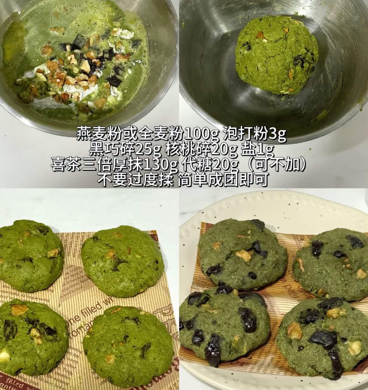 准备好燕麦粉,或者全麦粉,加入泡打粉,黑巧碎,坚果碎,代糖,揉一下,揉成面团,再把面团分成一个个小块。