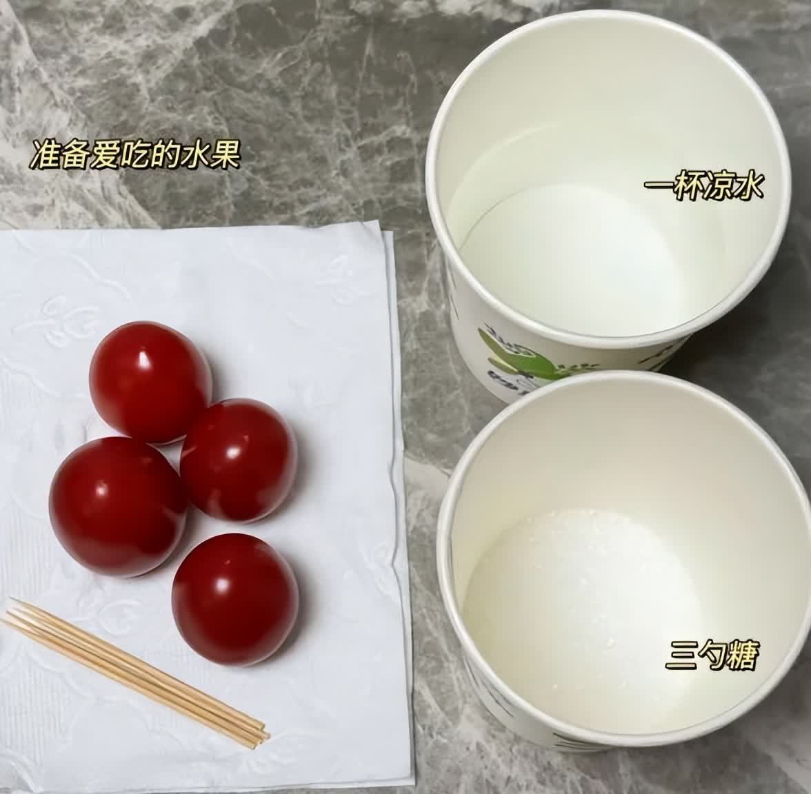 先准备好喜欢吃的水果,牙签、一杯凉水、三勺糖。