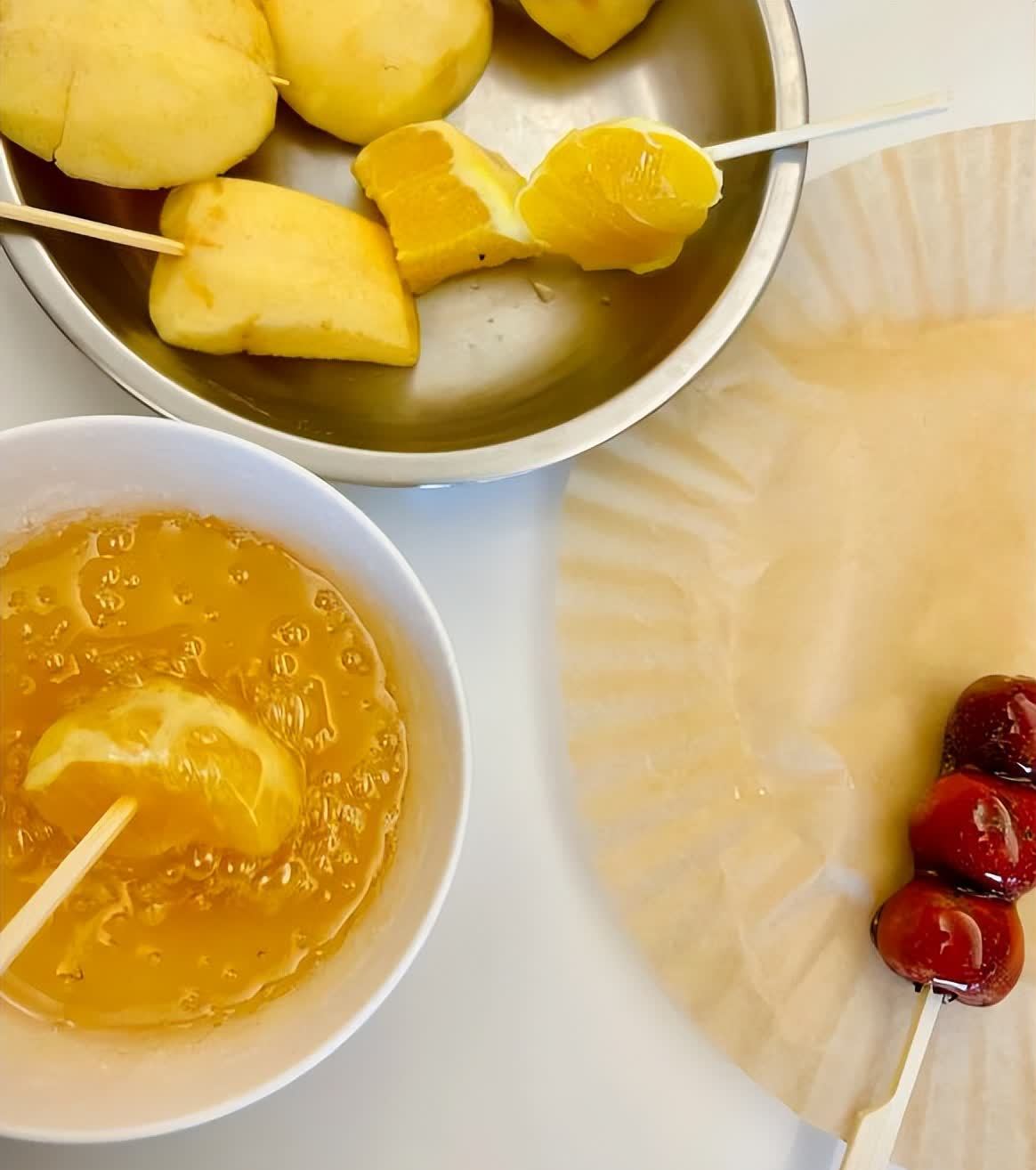 熬好糖浆之后,把水果往里面蘸一下,放凉后就可以吃了。