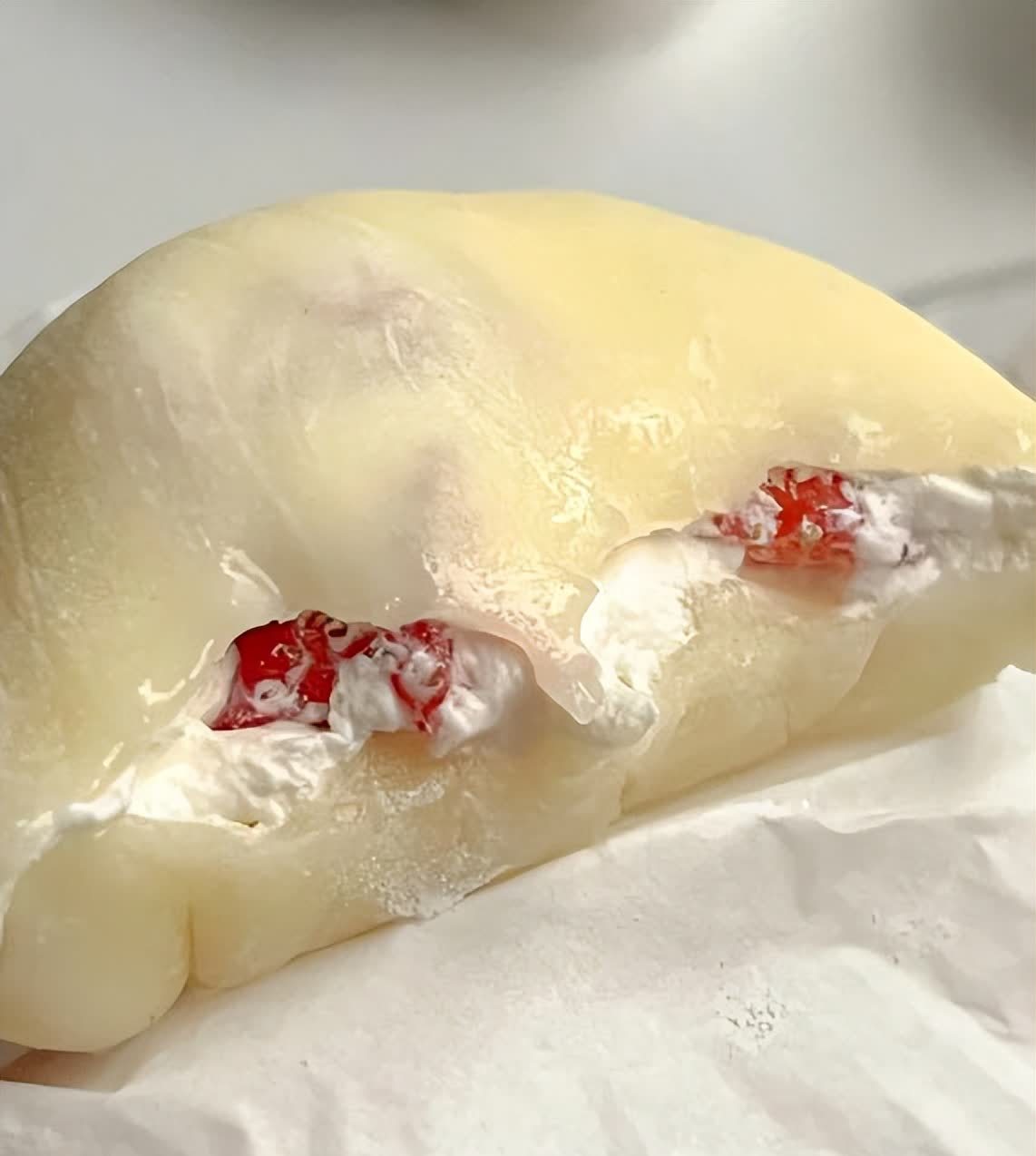 把面团分成同等大小,擀成面皮,装入打发好的奶油,水果,再盖上一层奶油,包裹好。