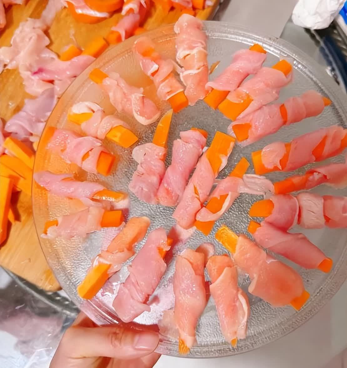 我是准备了鸡胸肉,胡萝卜,把胡萝卜切成条,用鸡胸肉包上。