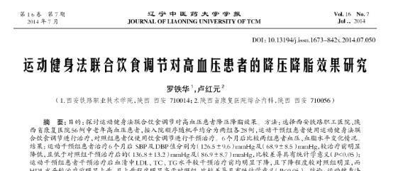 [1]罗铁华.运动健身法联合饮食调节对高血压患者的降压降脂效果研究,辽宁中医药大学学报,2014-07-01
