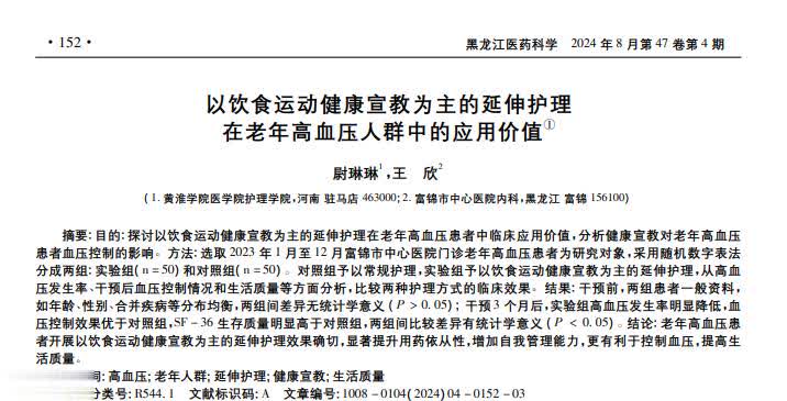 [1]尉琳琳.以饮食运动健康宣教为主的延伸护理在老年高血压人群中的应用价值 ,黑龙江医药科学,2024-08-06