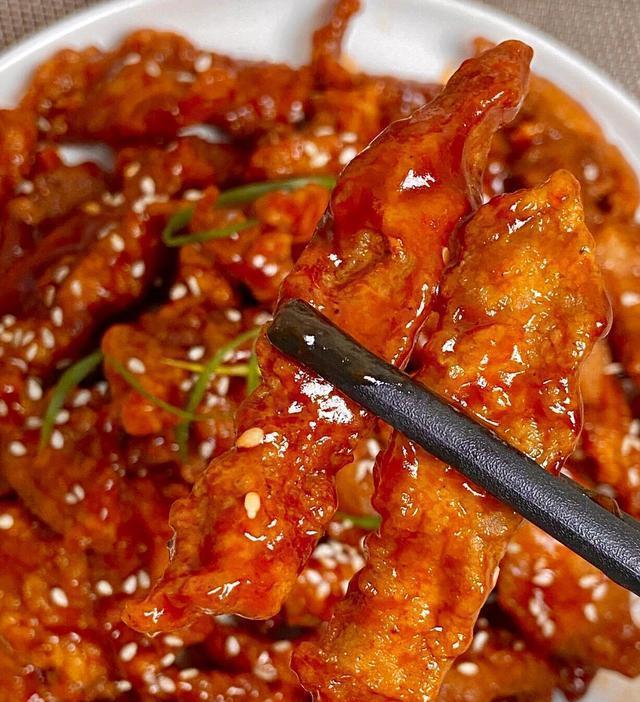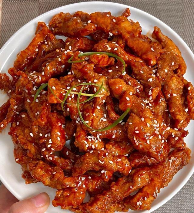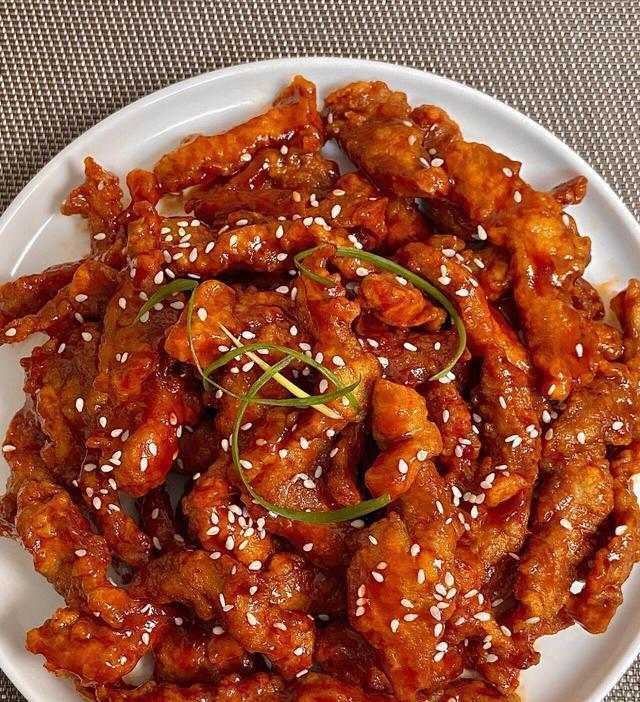 炒制出锅:将炸好的里脊肉倒入糖醋汁中,快速翻炒均匀,让每一条里脊都裹满酸甜可口的酱汁,最后撒上芝麻点缀即可出锅装盘。