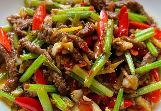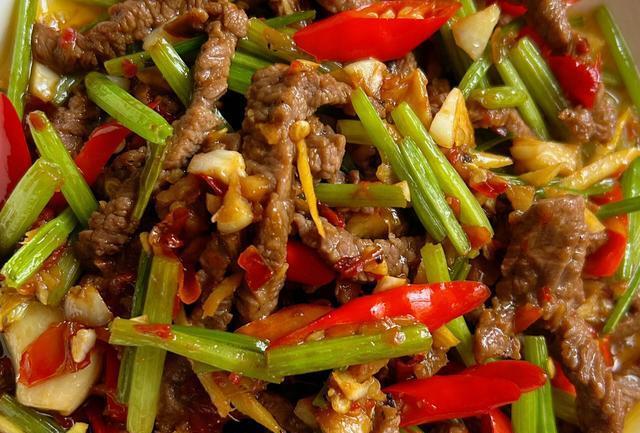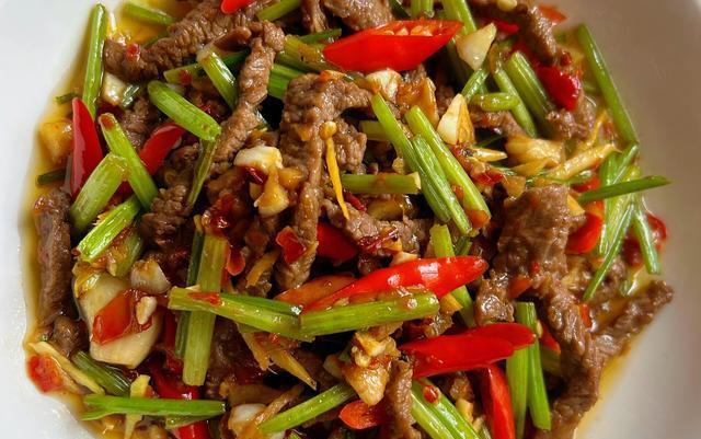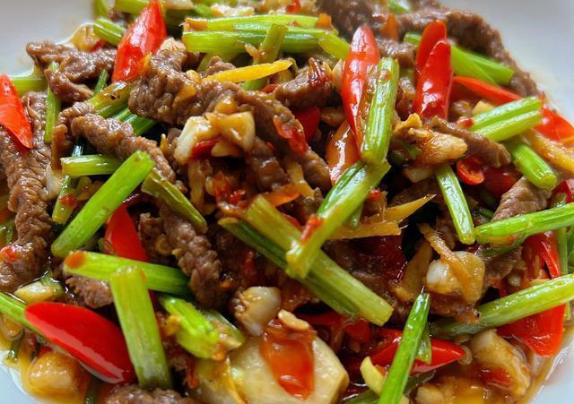 小炒黄牛肉的配菜主要有芹菜、小米辣和姜蒜。芹菜独特的香味与牛肉的嫩滑相结合,使得这道菜的口感更加丰富;小米辣的辣味可以增加菜肴的风味,同时姜蒜也是不可或缺的调味品。