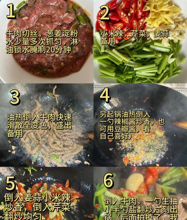 将牛肉丝、芹菜、小米辣和姜蒜分别切成适当的大小备用。注意切牛肉时要按照肉的纹理切,避免切断。
