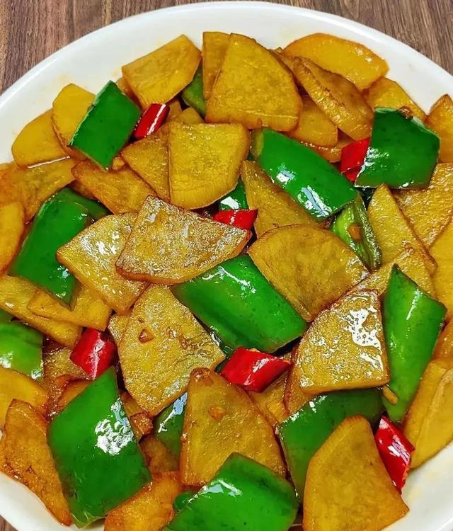 8. 出锅装盘:炒至土豆软糯,青椒微微软化后,关火,将菜肴盛出,装盘。
