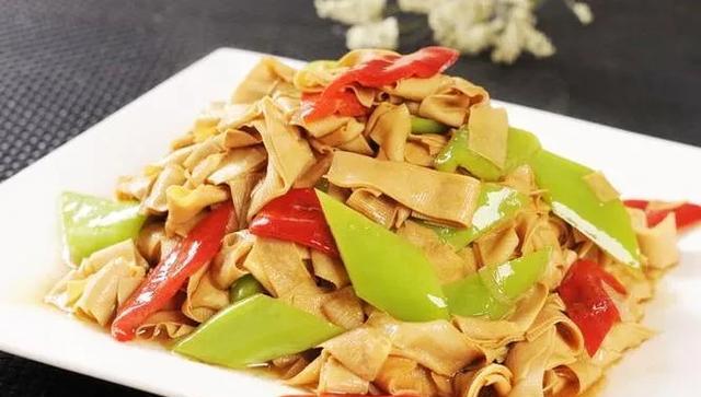 6. 加入豆皮炒匀:把泡发好的干豆皮放入锅中,快速翻炒均匀,让豆皮和辣椒充分混合。