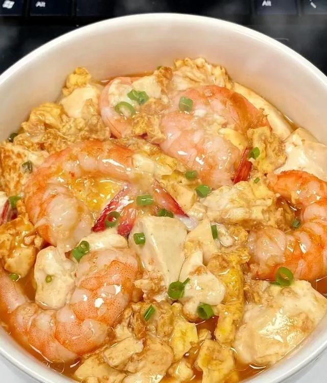 准备食材:大虾、青瓜、嫩豆腐、鸡蛋、葱蒜末。