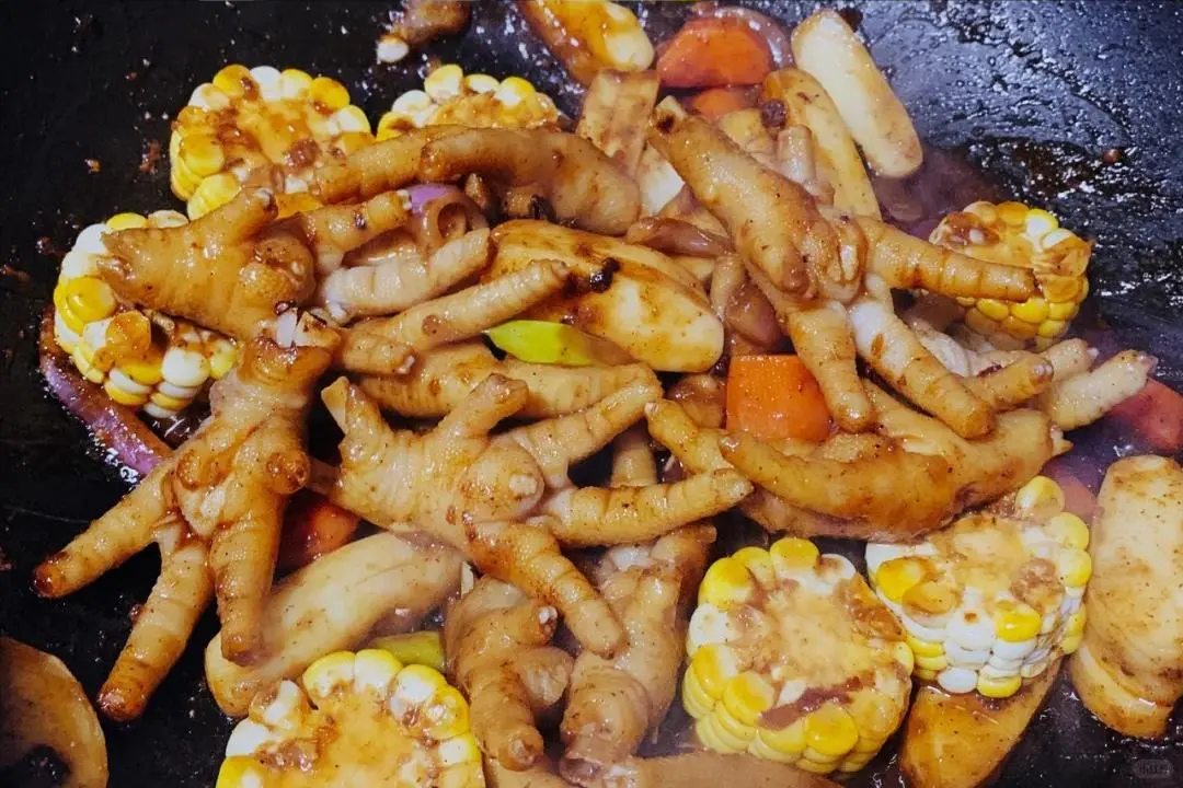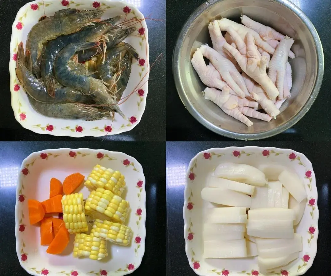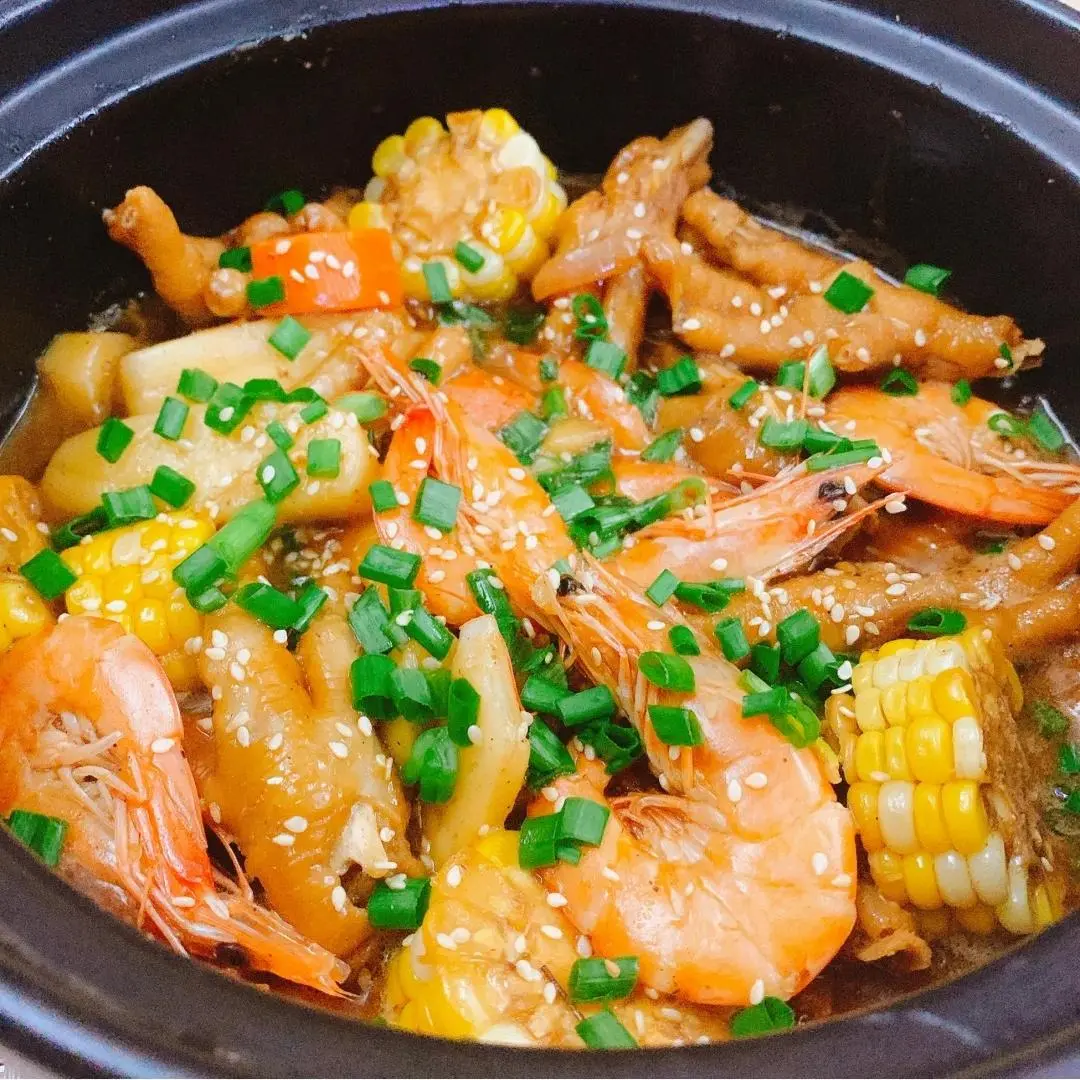 端上桌的时候,那香味直接扑鼻而来,鸡爪软糯得一嗦就脱骨,年糕吸满了汤汁,Q 弹又入味,虾也鲜嫩多汁,再配上清甜的胡萝卜和玉米,每一口都是满满的幸福感。
