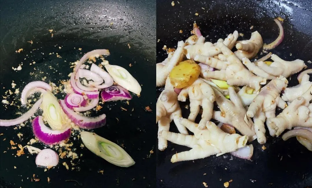 3、锅都不用洗,再往锅里多倒点油。油热了之后,把剩下的洋葱、大葱、蒜末倒进去,炒出香味来。这时候,把之前处理好的鸡爪、年糕、胡萝卜、玉米一股脑都倒进去,接着把调好的酱汁和那些干料也加进去,然后就开大火爆炒一会儿。
