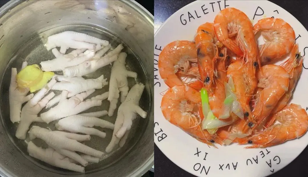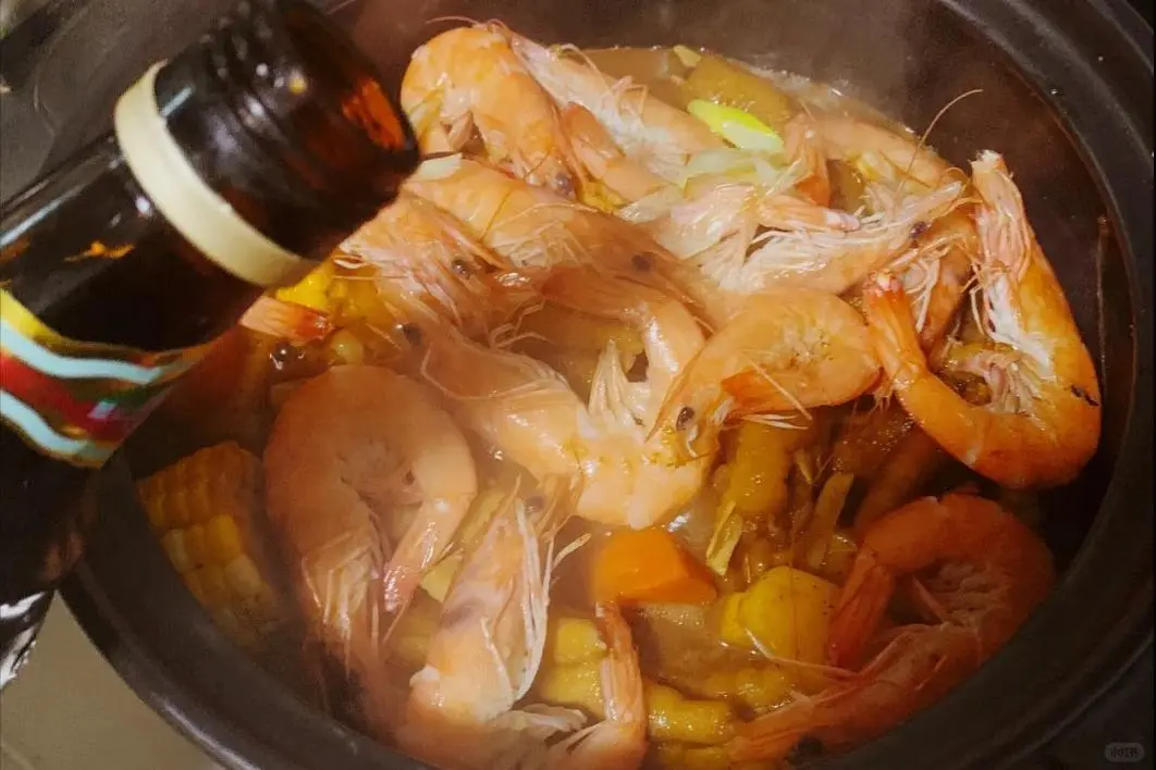 最后,把之前炒好的虾也放进砂锅里,再倒点福建老酒,接着再煮个 3 分钟。等时间一到,撒上葱花和芝麻,这道鲜虾鸡爪煲就大功告成啦!