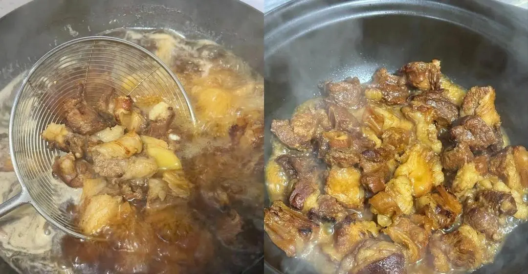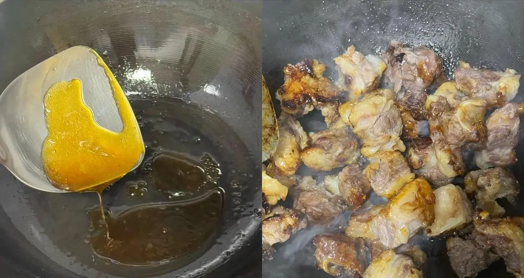 3、另起一口锅,往锅里放点冰糖和油,开中小火。这时候得盯着点,一边用铲子慢慢搅拌,看着冰糖一点点融化。等冰糖变成好看的焦糖色,就把牛腩倒进去翻炒。嘿,你瞧这牛腩,不一会儿颜色就变得红亮红亮的,老诱人了。接着往锅里撒 1 勺盐,再倒半碗刚才调好的酱汁,继续翻炒,让每一块牛腩都裹上酱汁,那香味一下子就出来了。炒得差不多了,就往锅里倒上开水。