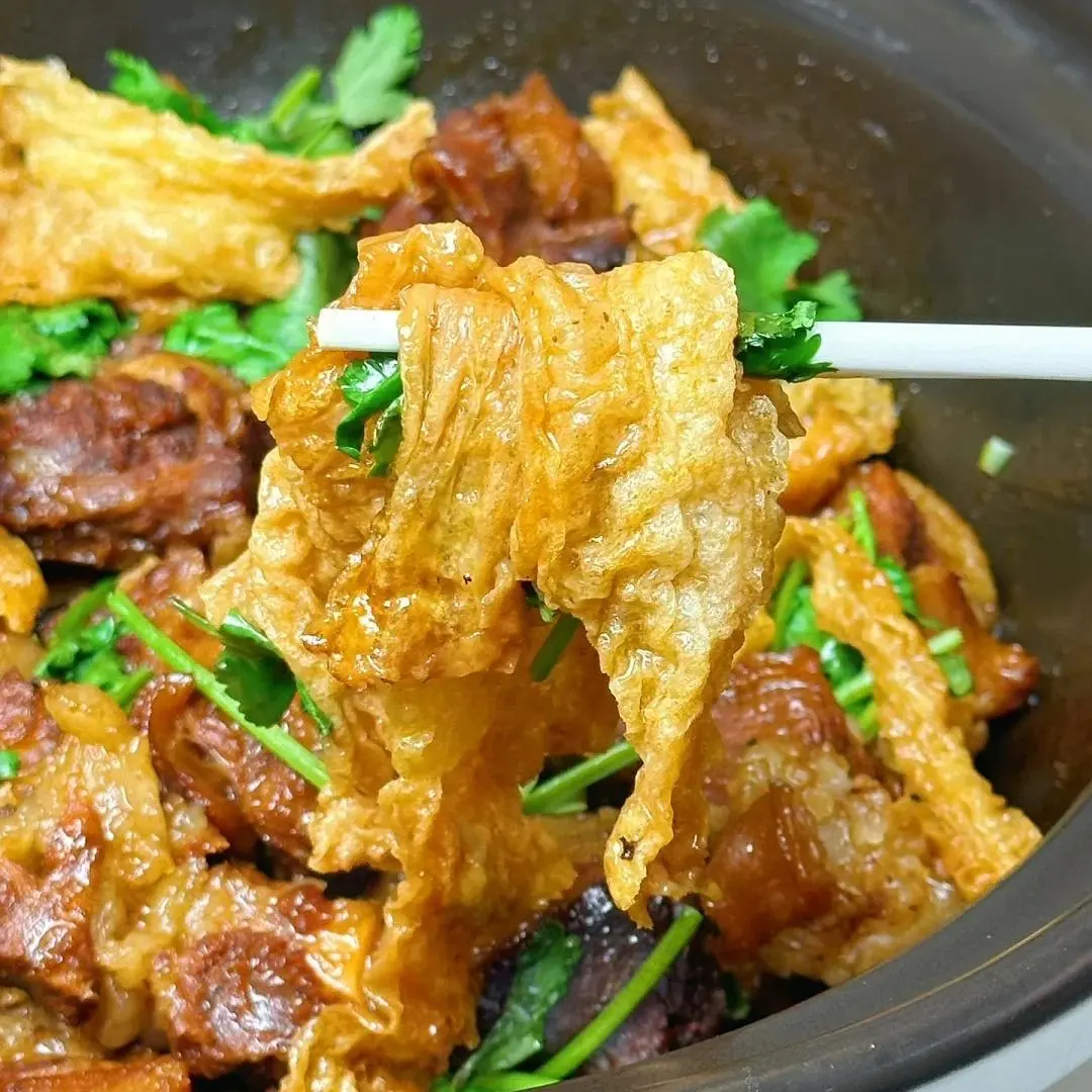 你们看这牛腩,炖得软烂入味,轻轻一咬就脱骨,满满的都是肉香。再看看这腐竹,吸饱了牛腩的汤汁,一口下去,浓郁的酱香在嘴里散开,那叫一个满足。这道菜配米饭,那简直就是绝配,我一顿能炫好几碗米饭,真不愧是米饭的 “头号杀手”。家人们,听我的,赶紧试试这道腐竹牛腩煲,保证你们吃一次就忘不了!