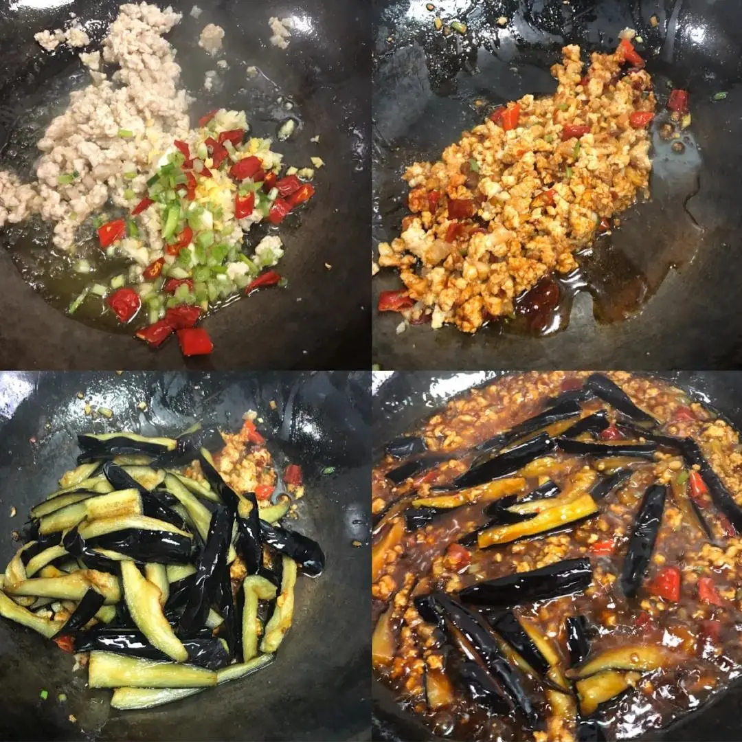 4、炸完茄子,锅里留少许底油,把肉沫倒进去炒。拿着铲子不停地翻炒,就像在给肉沫做按摩一样。等肉沫的颜色变白了,就把切碎的葱白、姜蒜和小米辣倒进去,使劲翻炒几下。这时候,厨房里那香味就开始弥漫开来了,感觉整个屋子都被这香味包围了。接着,把一勺郫县豆瓣酱放进去,继续翻炒。哇塞,这豆瓣酱一炒出红油,那香味瞬间就更上头了,感觉自己的鼻子都要被这香味 “俘虏” 了。