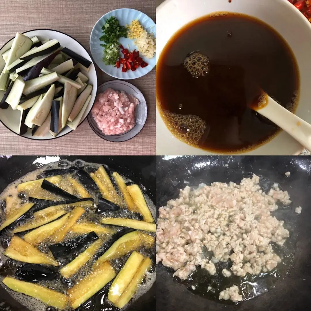 食材:茄子 3 个、肉沫 100 克、 2 根小葱、2 片姜、3 瓣蒜、几个小米辣、一勺郫县豆瓣酱、半勺老抽、2 勺生抽、1 勺陈醋、1 勺蚝油、1 勺糖、1 勺淀粉、半碗清水
