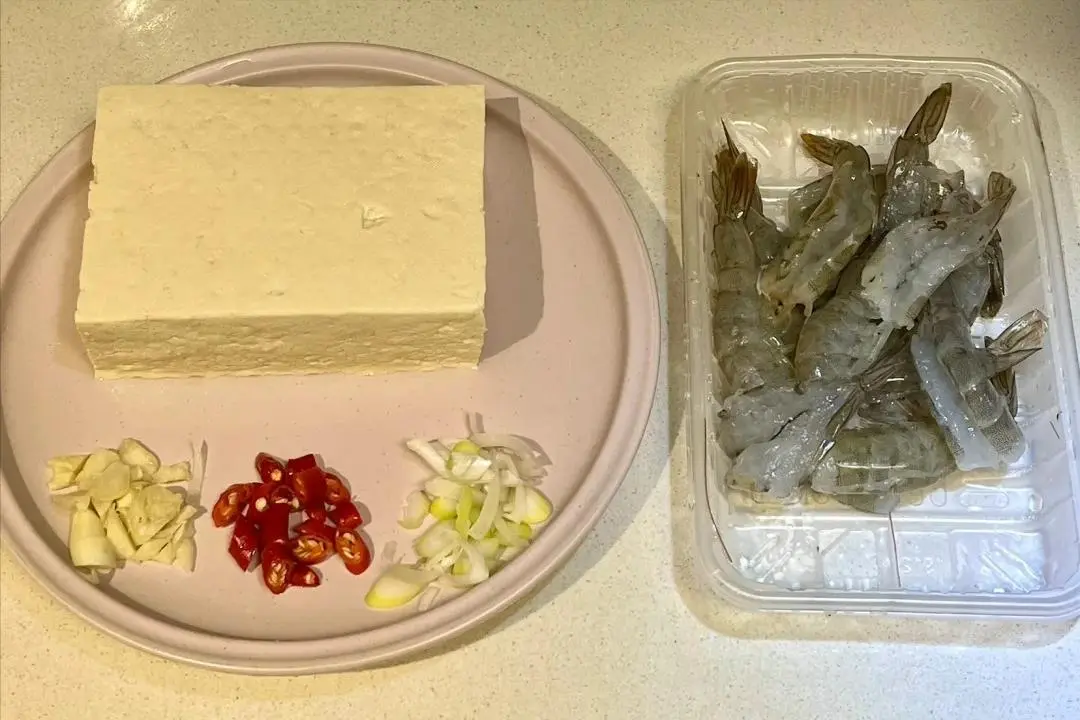 食材:一块老豆腐、几只大虾、葱、蒜、辣椒、辣椒