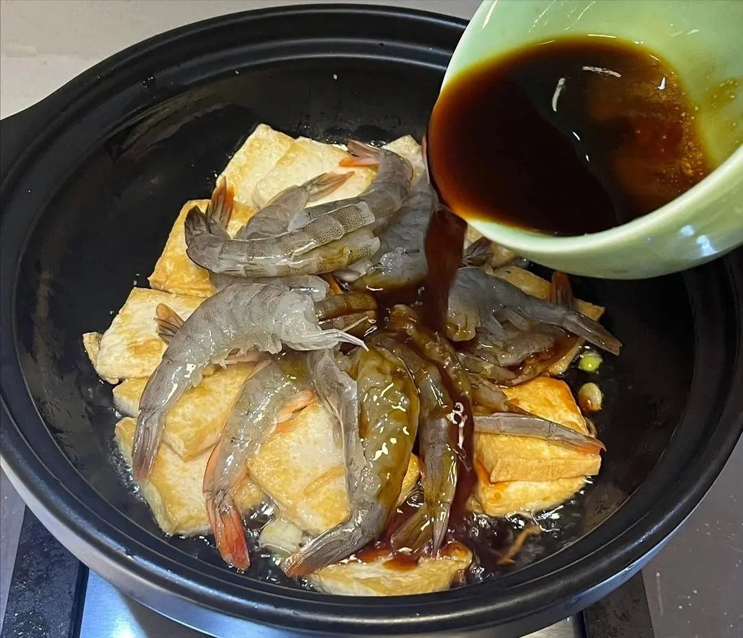 4、在砂锅里倒少许油,把切好的葱和蒜放进去爆香。把煎好的豆腐放进去,然后把处理好的大虾均匀地铺在豆腐上,接着把刚才调好的料汁慢慢地倒入砂锅里,让料汁没过豆腐和大虾。盖上锅盖,让它们在砂锅里闷个 6 - 7 分钟。豆腐会充分吸收料汁的味道,变得更加入味,大虾也会在料汁的炖煮下变得鲜嫩多汁。