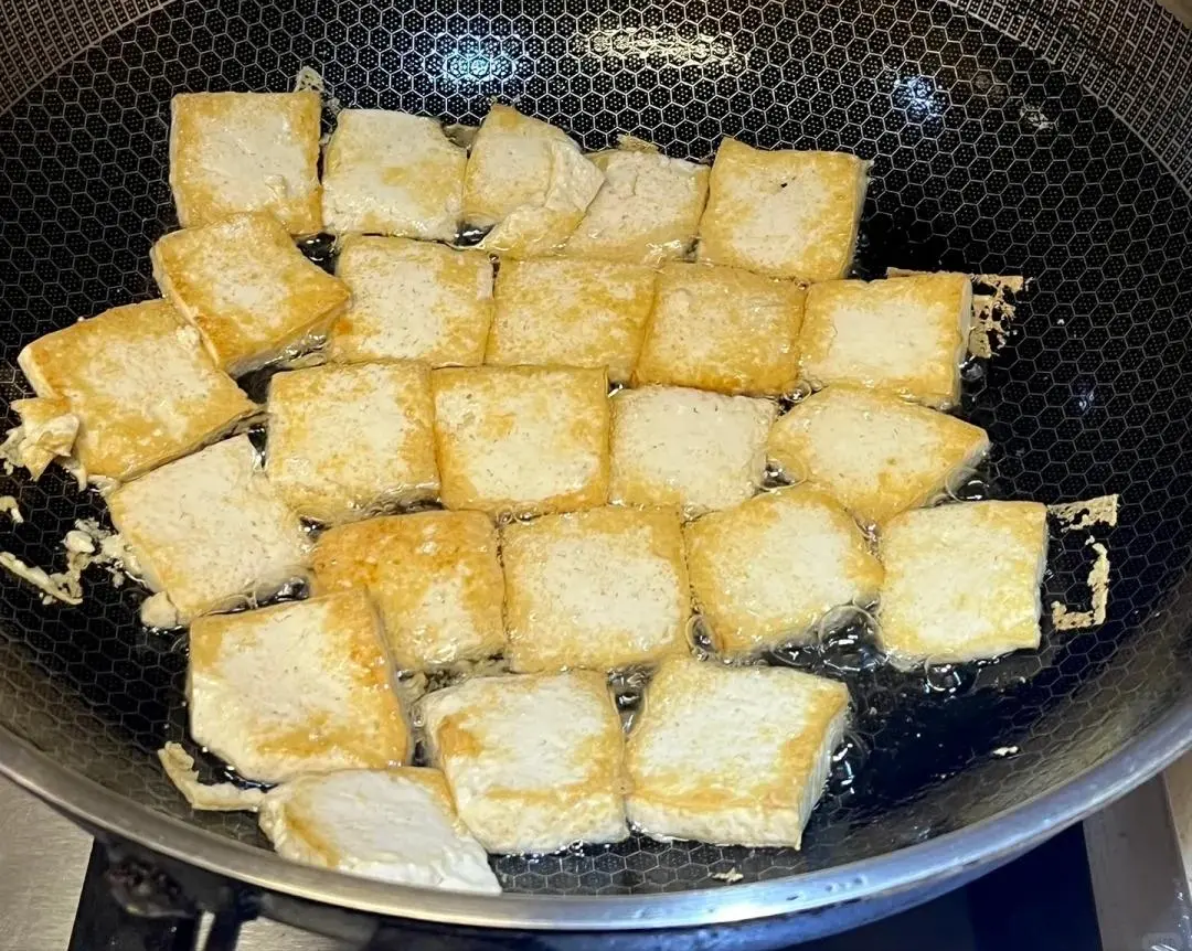 3、现在开始处理豆腐。起锅烧油,等油热了之后,把切好的豆腐块放进锅里煎。等到豆腐煎至两面金黄,看起来外皮酥脆,就可以把它盛出来备用啦。