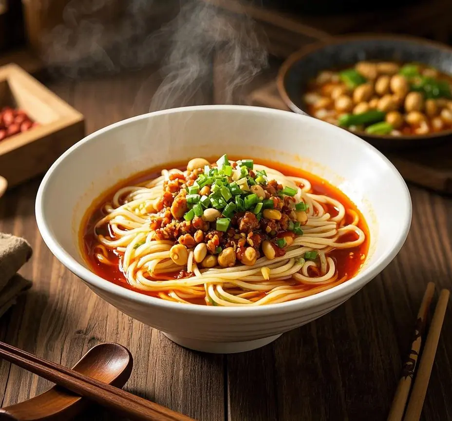 再把目光投向“天府之国”四川,担担面犹如一颗美食皇冠上的明珠。时光回到 1841 年,一位姓陈的师傅挑着扁担,走街串巷,一声声吆喝中,担担面诞生了。它巧妙地融合了汤面与拌面之长,汤头是它的秘密武器。酱油提鲜、芝麻酱增香、花生碎添脆、辣椒油加辣,各种味道交织在一起,形成了一种独一无二的香辣气场。吃上一口,那香辣的口感像小鞭炮在嘴里炸开,让人越吃越上瘾。到了四川,若没尝尝担担面,那可就好比去北京没登长城,实在是有遗憾。