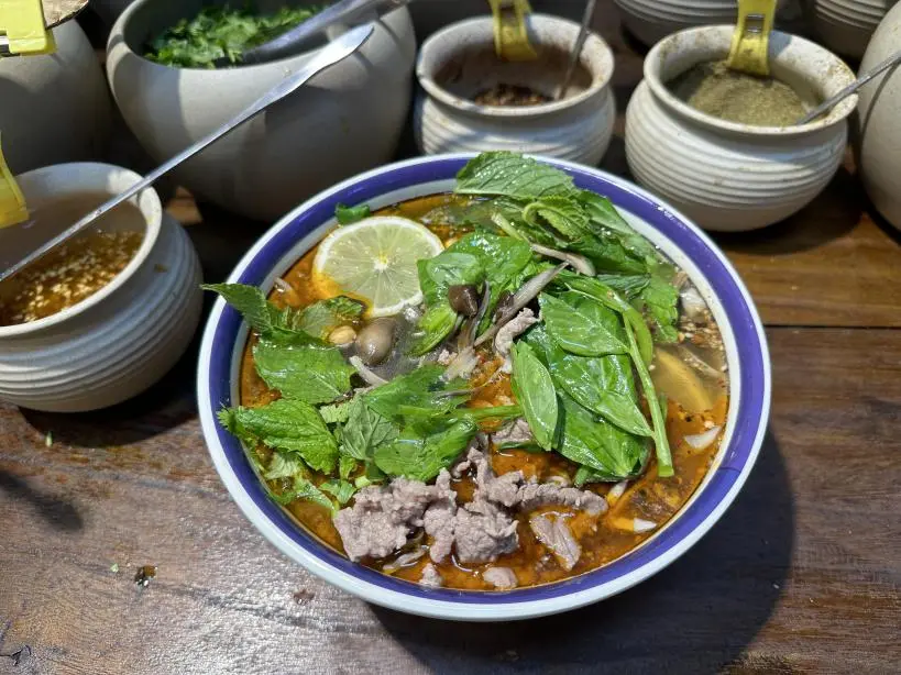 汤底是灵魂!酸酸辣辣特别开胃,带着点柠檬和香茅的清新。重点是肉给得超实在!新鲜手切肉,加上香喷喷的肉酱,米线滑溜溜的,吸饱了汤汁嗦起来太满足了。