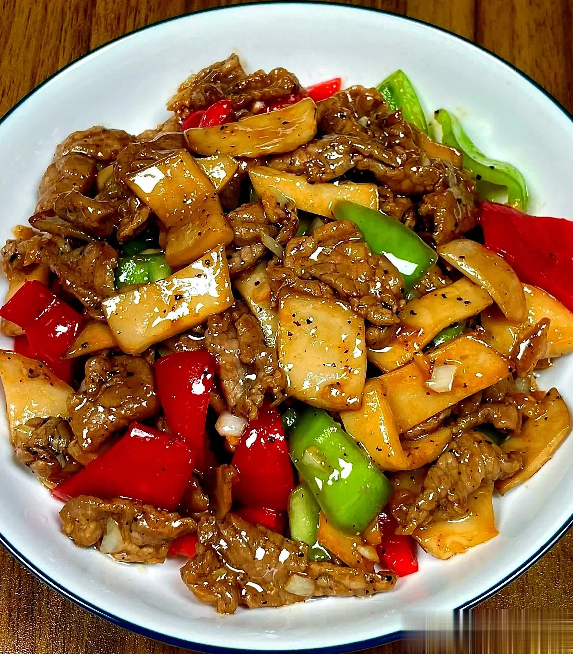 食材: 牛里脊、杏鲍菇、青红椒、蒜、生抽、老抽、淀粉