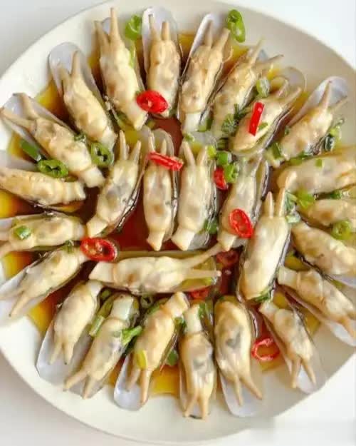 2、将焯好的蛏子过一下凉水,然后去壳,并撕掉蛏肉边缘的黑线,整齐地码放在盘中。