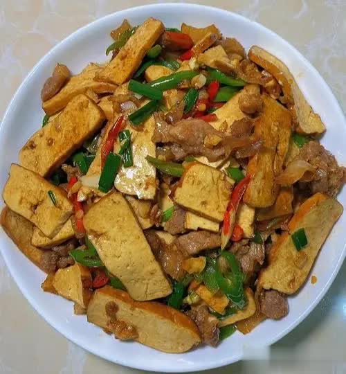 5. 倒入煎好的香干和肉片,加1勺生抽翻炒均匀。