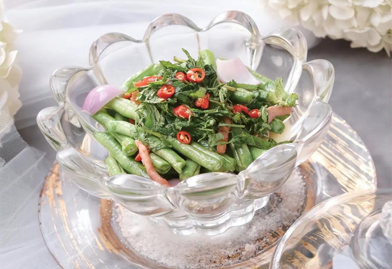 3.净锅放底油烧热,下入瘦肉丝炒散,放小米椒节、姜片、蒜片、干葱片炒香,再加入无筋豆节、洋葱块翻炒均匀,调入盐和少许味精,用水淀粉勾薄芡后出锅,淋入橄榄油,撒上薄荷碎,拌匀即可食用。