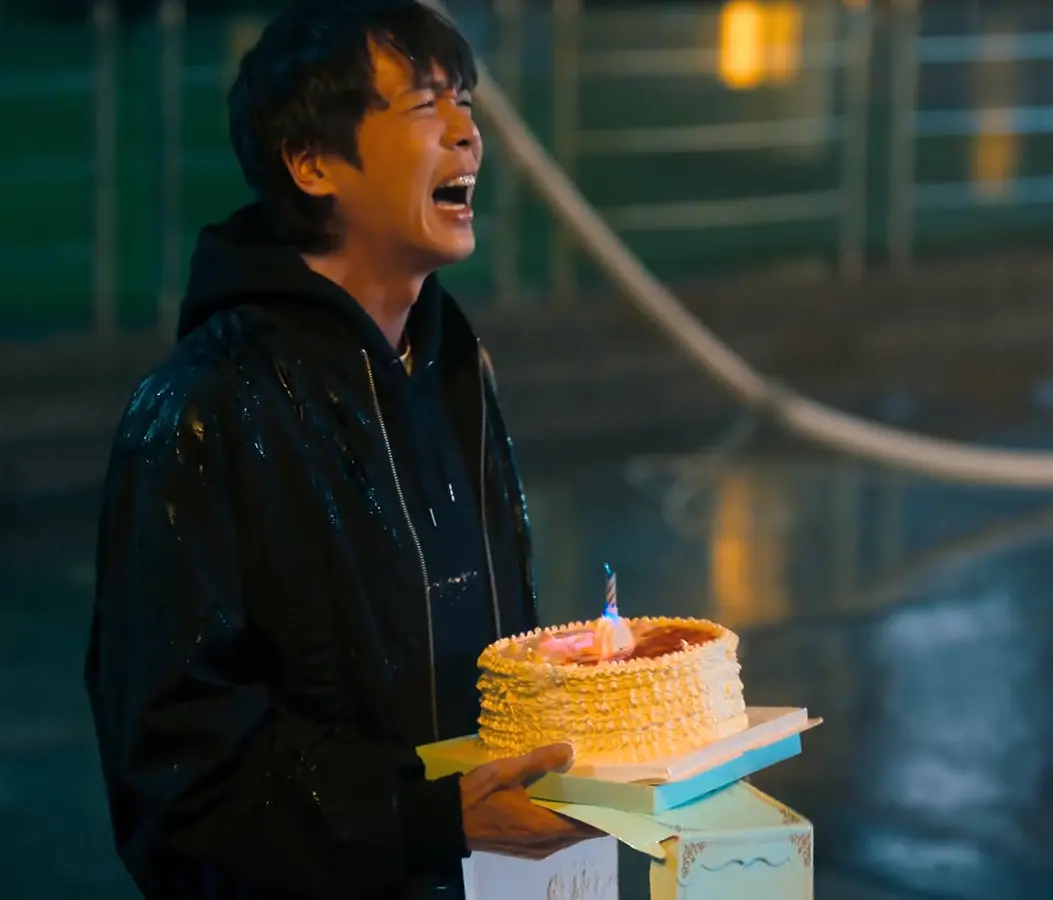 还有一场捧着蛋糕雨中痛哭的戏,带着眼泪的哭着笑,雨里仰头喊不出声,都让观众看着揪心,明明没见过母亲,却用一场戏演出了对母亲极致的爱。