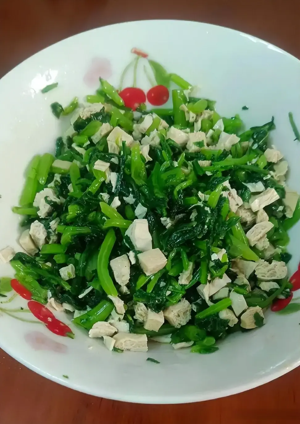 4. 将沥干水分的茼蒿段放入装有豆腐块的碗中。