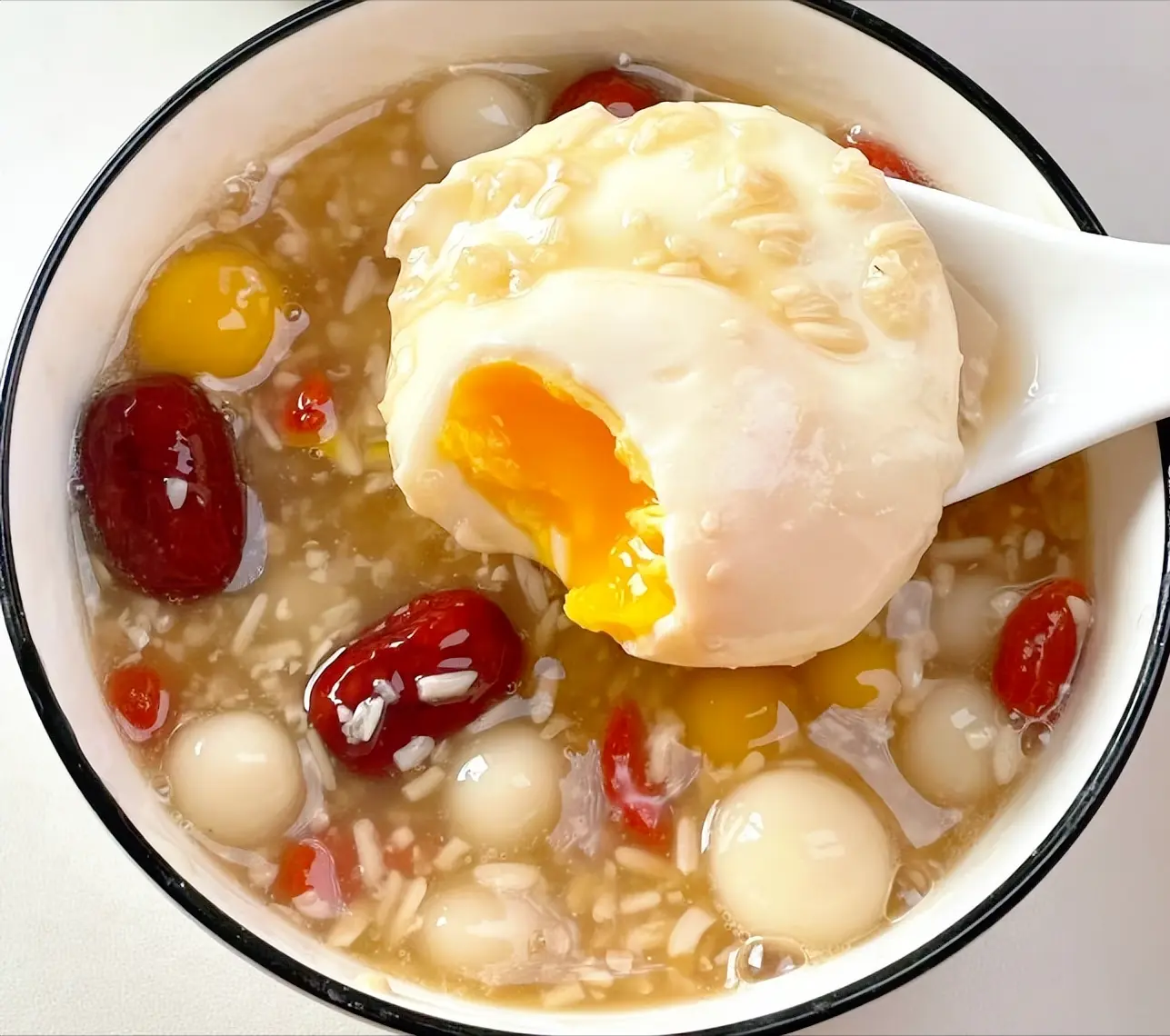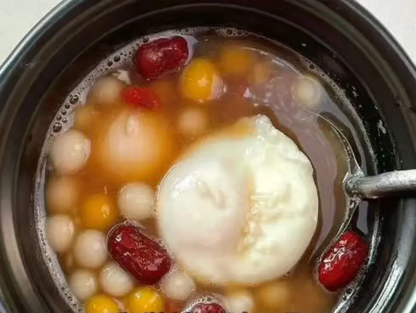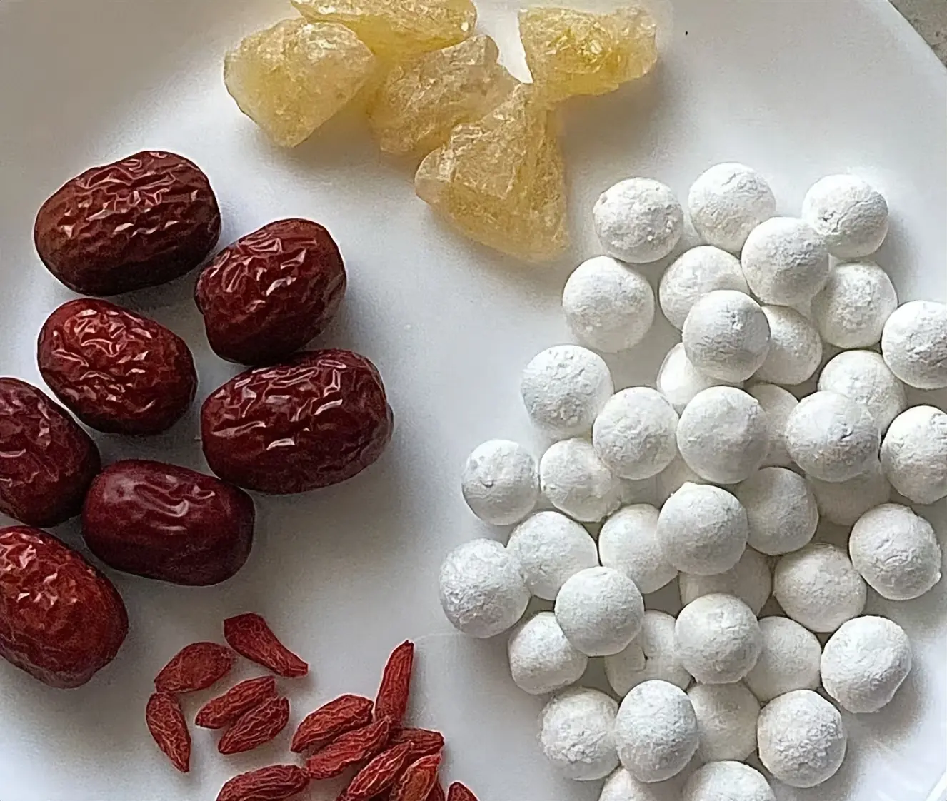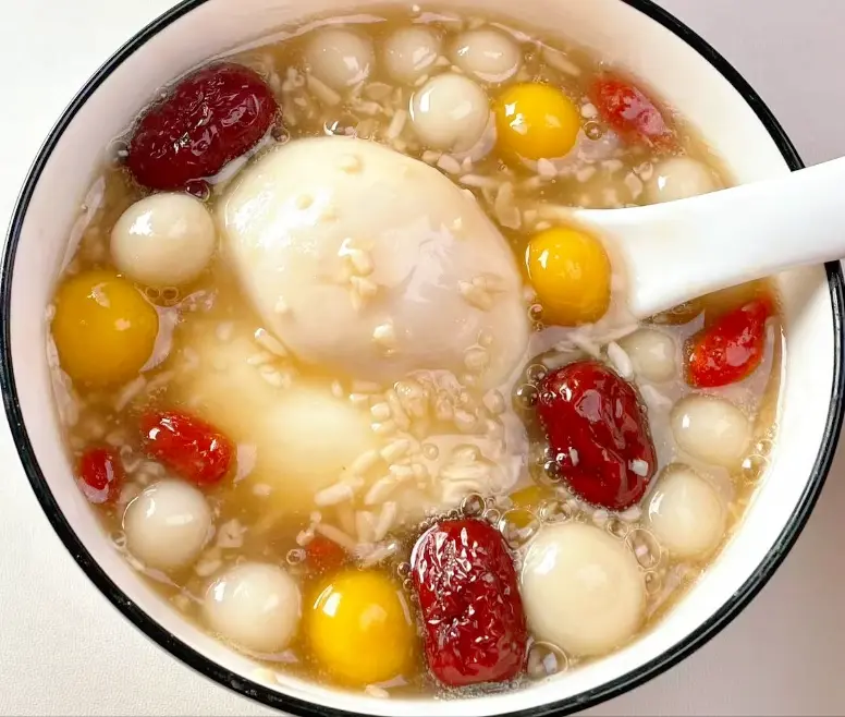 食材:双色糯米丸子、红枣、枸杞、荷包蛋、冰糖或红糖。