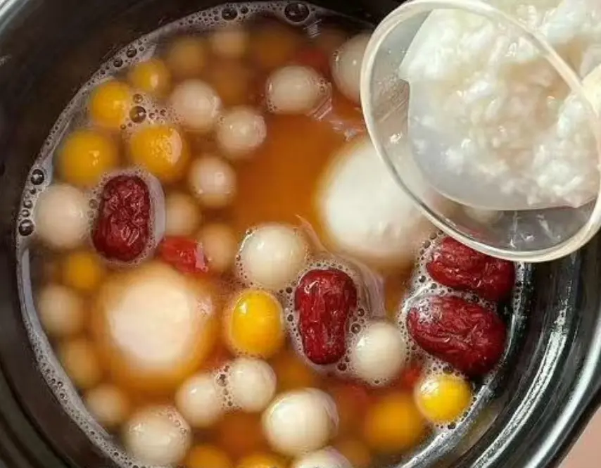 这里的“一白一红”指的是红枣和酒酿,红枣营养丰富,女人多吃可以补气血,搭配上驱寒滋补的甜酒酿一起,对女人更友好了,暖身补气血女人气色红润。搭配上糯米小丸子一起煮糖水,好吃解馋又营养,女人别错过哦。