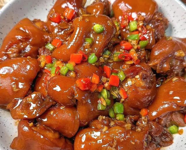 卤好的猪蹄切小块,热油爆香蒜末辣椒,倒猪蹄翻炒,加少许生抽调味,炒2分钟就能出锅。