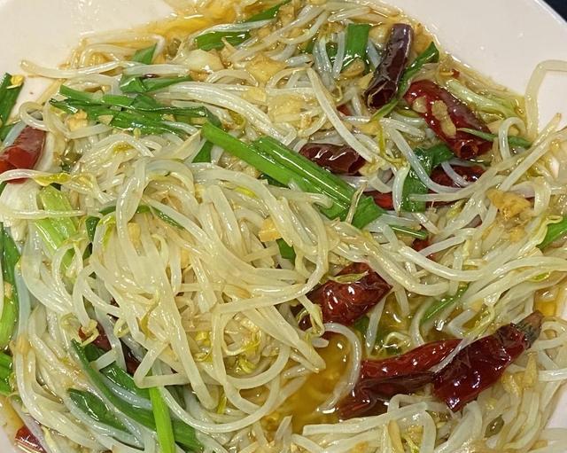 豆芽焯水捞出,热油炒香辣椒蒜末,倒豆芽加醋和盐,大火快炒1分钟就好。