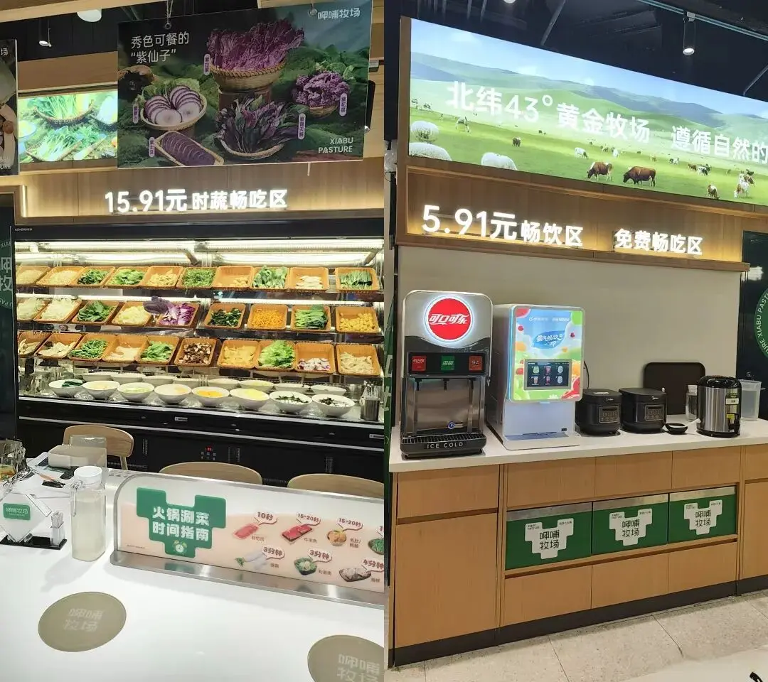 在此背景下,呷哺集团推出的自选小火锅品牌 “呷哺牧场”,正是其对行业平价化趋势的主动回应。该品牌以半自助、小规模门店为载体,通过 “15.91 元蔬菜畅吃” 等模式降低消费门槛,人均消费控制在 29.82元起,精准切入大众市场。
