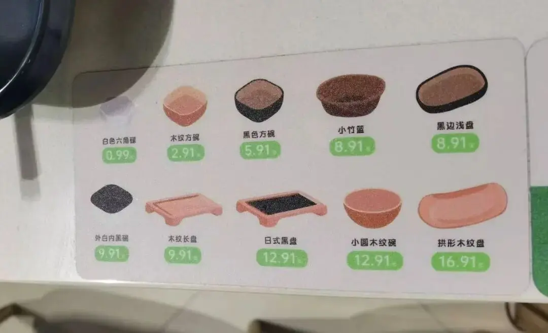 计价方式采用按盘型收费:木纹方碗2.91元,黑色方碗5.91元,小竹篮或黑边浅盘8.91元;外白内黑碗或木纹长盘每份9.91元;日式黑盘或小圆木纹碗每份12.91元;拱形木纹盘,每份16.91元。
