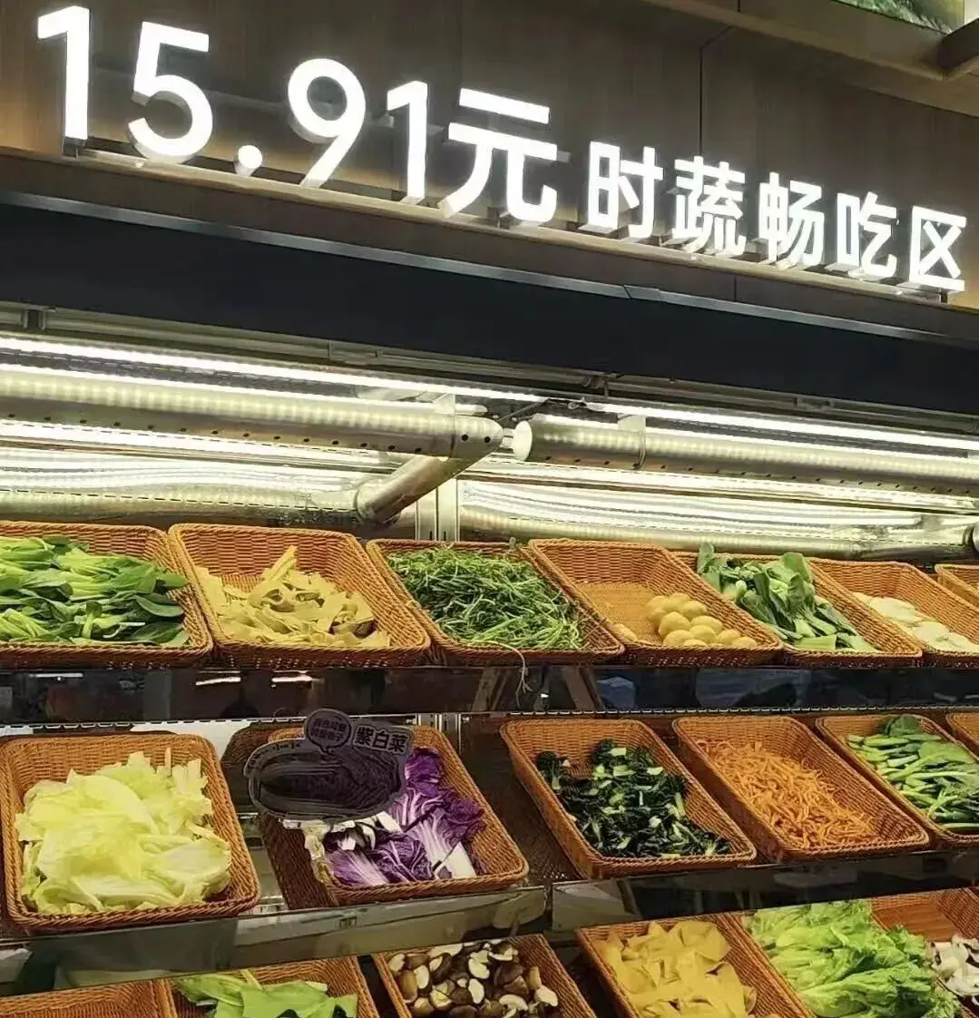 而呷哺此次选择了一条差异化路径:并未全线推行自助,而是创新推出 “自选 + 自助” 组合模式。该模式以 15.91元的蔬菜自助作为引流入口,以高性价比吸引客流;而在肉类等高价值菜品上,则坚持采用自选模式,保障食材品质与用餐体验。